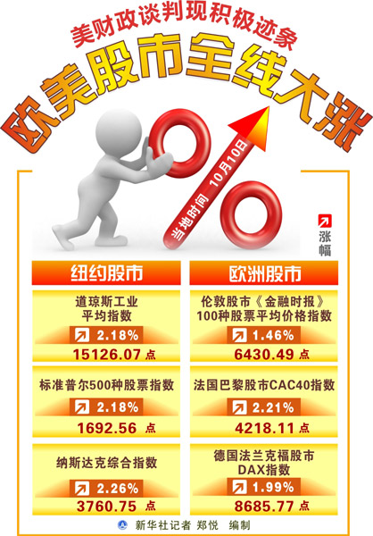 受美國政府財政談判出現(xiàn)積極跡象推動,紐約股市三大股指10日大漲,漲幅均超過2%。