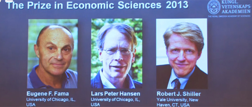 2013年度諾貝爾經(jīng)濟(jì)學(xué)獎(jiǎng)獲得者:尤金·法馬、拉爾斯·皮特·漢森、羅伯特·J·席勒(由左至右)