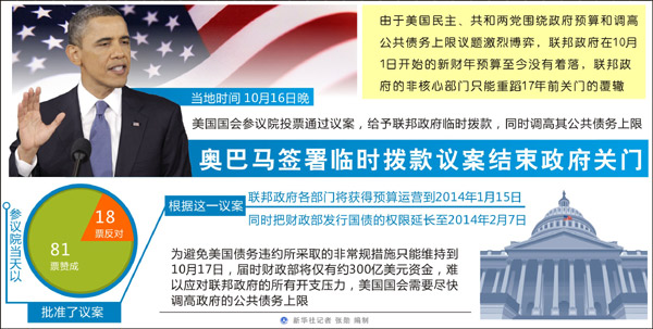 圖表:奧巴馬簽署臨時(shí)撥款議案結(jié)束政府關(guān)門 新華社記者 張勛 編制