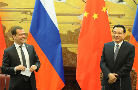 10月22日,中國國務院總理李克強在北京人民大會堂與俄羅斯總理梅德韋杰夫共同簽署《中俄總理第十八次定期會晤聯(lián)合公報》,提出采取切實措施促進雙邊貿(mào)易額增長,到2015年達到1000億美元,到2020年達到2000億美元,同時加強在相互提供出口信貸、保險、項目融資和使用銀行卡等領域內(nèi)的合作。圖為李克強在北京人民大會堂與梅德韋杰夫共同會見記者。