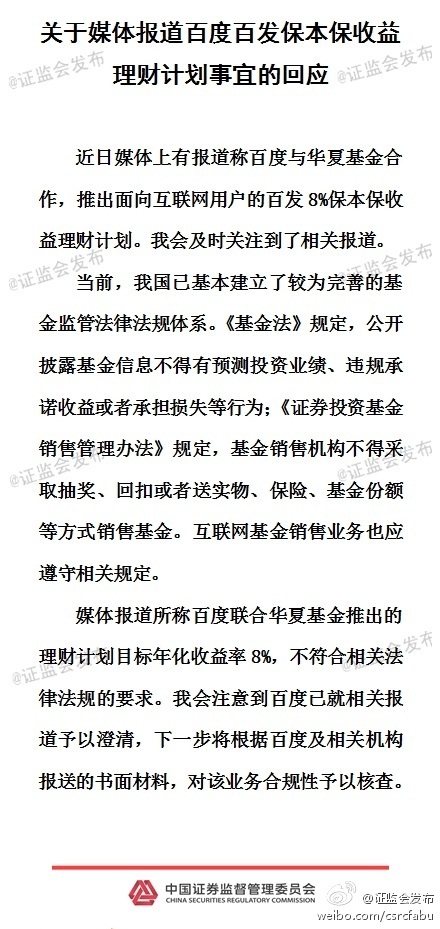 媒體報(bào)道所稱百度聯(lián)合華夏基金推出的理財(cái)計(jì)劃目標(biāo)年化收益率8%,不符合相關(guān)法律法規(guī)的要求。我會(huì)注意到百度已就相關(guān)報(bào)道予以澄清,下一步將根據(jù)百度及相關(guān)機(jī)構(gòu)報(bào)送的書(shū)面材料,對(duì)該業(yè)務(wù)合規(guī)性予以核查。