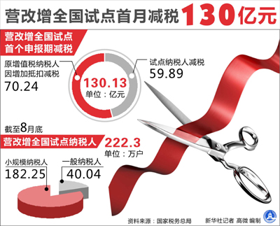 《經(jīng)濟(jì)參考報》記者從國家稅務(wù)總局獲悉,1至8月,原增值稅一般納稅人(貨物制造和流通企業(yè))增加抵扣減稅362.7億元!盃I改增”全國試點(diǎn)首月,即8月一個月,共減稅130.13億元。
