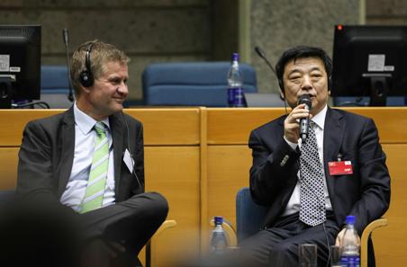 10月28日,中國石化總裁李春光(右)在領(lǐng)導(dǎo)力圓桌會議上回答提問。新華社記者孟晨光攝