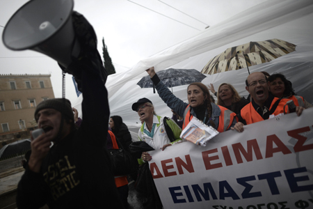 希臘工人6日舉行全國性24小時大罷工,抗議政府實行財政緊縮政策,公共服務(wù)部門基本癱瘓。由于交通部門工人罷工,航運以及其他交通運輸幾乎停頓。同時,國際借貸方目前正在考慮是否向希臘進一步發(fā)放救援資金。圖為抗議者冒雨在希臘首都雅典游行。