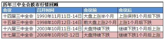 1998年10月12日-14日,十五屆三中全會,會議前大盤上漲2個月,會后上漲1個月后下跌。