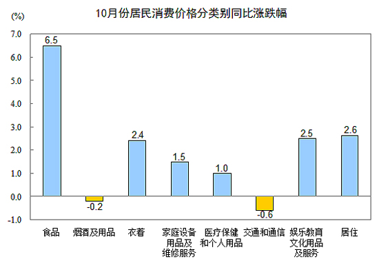 10月份,食品價(jià)格同比上漲6.5%,影響居民消費(fèi)價(jià)格總水平同比上漲約2.11個(gè)百分點(diǎn)。其中,鮮菜價(jià)格上漲31.5%,影響居民消費(fèi)價(jià)格總水平上漲約0.81個(gè)百分點(diǎn);肉禽及其制品價(jià)格上漲5.8%,影響居民消費(fèi)價(jià)格總水平上漲約0.43個(gè)百分點(diǎn)(豬肉價(jià)格上漲5.2%,影響居民消費(fèi)價(jià)格總水平上漲約0.16個(gè)百分點(diǎn));鮮果價(jià)格上漲8.8%,影響居民消費(fèi)價(jià)格總水平上漲約0.17個(gè)百分點(diǎn);水產(chǎn)品價(jià)格上漲6.4%,影響居民消費(fèi)價(jià)格總水平上漲約0.16個(gè)百分點(diǎn);糧食價(jià)格上漲3.8%,影響居民消費(fèi)價(jià)格總水平上漲約0.11個(gè)百分點(diǎn)。