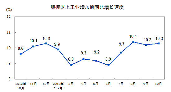 2013年10月份,規(guī)模以上工業(yè)增加值同比實際增長10.3%(以下增加值增速均為扣除價格因素的實際增長率),比9月份加快0.1個百分點。從環(huán)比看,10月份,規(guī)模以上工業(yè)增加值比上月增長0.86%。1-10月,規(guī)模以上工業(yè)增加值同比增長9.7%。