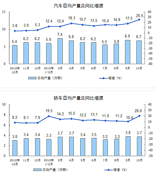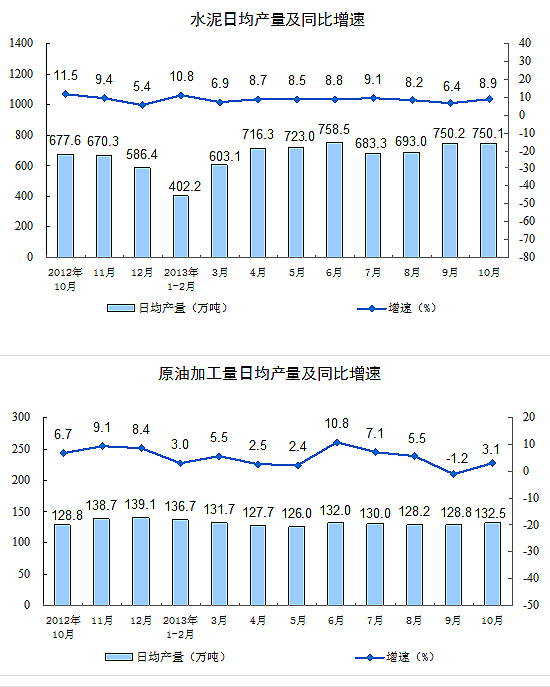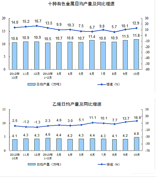 分產(chǎn)品看,10月份,464種產(chǎn)品中有328種產(chǎn)品同比增長。其中,發(fā)電量4305億千瓦時,同比增長8.4%;鋼材9281萬噸,增長12.3%;水泥23254萬噸,增長8.9%;原油加工量4108萬噸,增長3.1%;十種有色金屬365萬噸,增長12.9%;乙烯149萬噸,增長16.9%;汽車208.5萬輛,增長25.5%;轎車115.6萬輛,增長20.0%。