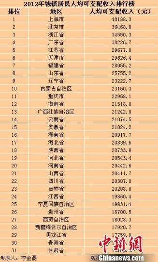結(jié)果顯示,上海、北京、浙江這3個地區(qū)位列前三名。其中,上海2012年城鎮(zhèn)居民人均可支配收入最高,達(dá)到了40188.3元。北京排名第二,為36468.8元;浙江排名第三,為34550.3元。