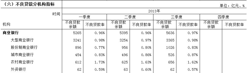 銀監(jiān)會(huì)網(wǎng)站13日消息,2013年第三季度末商業(yè)銀行不良貸款總額5636億元,不良貸款率為0.97%。其中農(nóng)村商業(yè)銀行不良貸款率最高,達(dá)1.62%。