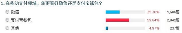 11月21日消息,在鳳凰科技推出的“在移動支付領域,您更看好微信還是支付寶錢包”的調查中,有約59.6%的網(wǎng)友看好支付寶錢包,有約35.4%的網(wǎng)友看好微信,另約有5%的網(wǎng)友選擇了“其他”。截止目前,本次調查共有4765名網(wǎng)友參加。