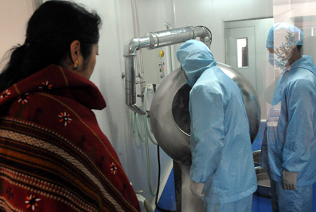 專家學(xué)者、宗教界人士和醫(yī)護(hù)人員代表日前齊聚一堂,共同慶祝北京藏醫(yī)院成立20周年,并參觀北京藏醫(yī)院新設(shè)立在北京市昌平區(qū)南口鎮(zhèn)的藏藥研究和加工機(jī)構(gòu)。目前,北京藏醫(yī)院制作了500余種藏藥材標(biāo)本,根據(jù)國家要求開始制定藏藥標(biāo)準(zhǔn),旨在為藏醫(yī)藥發(fā)展打下堅實的基礎(chǔ)。圖為與會者在參觀北京藏醫(yī)院南口基地的藏藥生產(chǎn)。