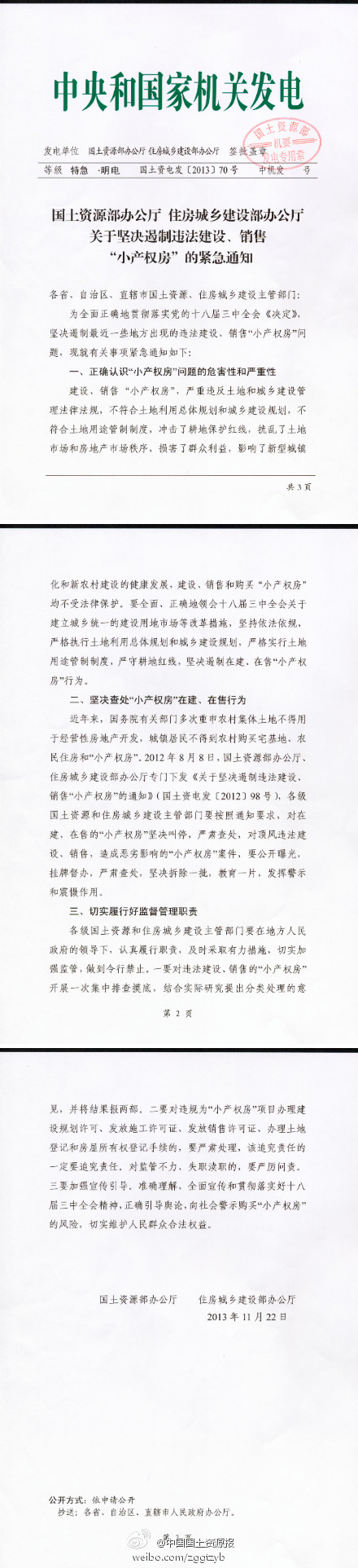 11月22日,國土資源部辦公廳、住房和城鄉(xiāng)建設(shè)部辦公廳聯(lián)合發(fā)出緊急通知,要求各省級國土資源、住房城鄉(xiāng)建設(shè)主管部門全面、正確領(lǐng)會黨的十八屆三中全會關(guān)于建立城鄉(xiāng)統(tǒng)一的建設(shè)用地市場等改革措施,堅決遏制最近一些地方出現(xiàn)的違法建設(shè)、違法銷售“小產(chǎn)權(quán)房”問題。