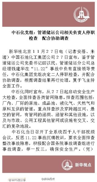 【中石化管道儲運公司相關(guān)負責(zé)人停職檢查】中國石油化工集團公司27日宣布,鑒于管道儲運公司黨委書記田以民、管道儲運分公司總經(jīng)理錢建華在“11.22”事故中負有直接領(lǐng)導(dǎo)責(zé)任,中石化集團黨組決定二人停職檢查,并配合協(xié)助調(diào)查,根據(jù)調(diào)查結(jié)果再行處理。詳見上圖。