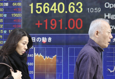 圖為28日,在日本東京,行人經(jīng)過一家證券公司外的電子股票顯示屏。
