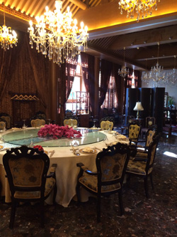 “大廳套餐有每位500元、800元兩種,一直以來只提供套餐。前段時間風聲緊,臨時推出了單點,F(xiàn)在基本回暖了,準備取消單點!币沂焙S盘玫旯ぷ魅藛T介紹,“包廂內(nèi)價格不含酒水最低每人800元,外加收15%服務(wù)費;比較受顧客青睞的是具有皇家氣派的大房間。”