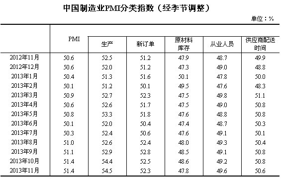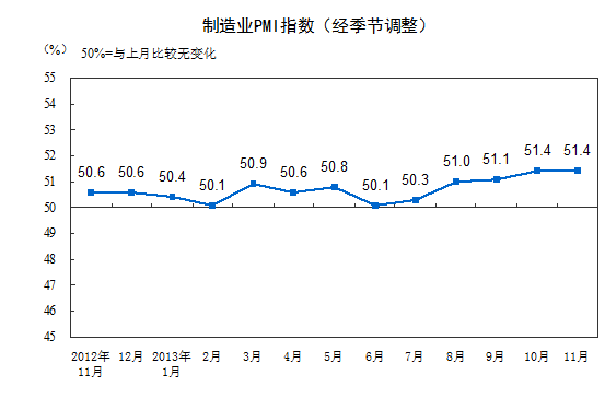 統(tǒng)計局12月1日公布數(shù)據(jù)顯示,2013年11月,中國制造業(yè)采購經(jīng)理指數(shù)(PMI)為51.4%,與上月持平,為2012年5月以來的高點,連續(xù)14個月位于臨界點以上,表明我國制造業(yè)繼續(xù)穩(wěn)中向好。