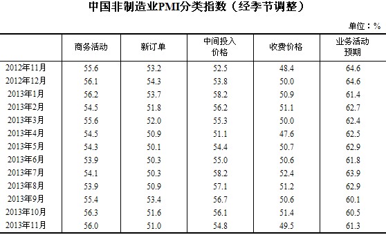 2013年11月,中國(guó)非制造業(yè)商務(wù)活動(dòng)指數(shù)為56.0%,比上月回落0.3個(gè)百分點(diǎn)。