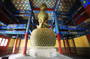 中國古代最精美的銅鑄毗盧佛 毗盧殿位于隆興寺中軸線最末端,殿內(nèi)的毗盧佛堪稱國寶,毗盧佛設(shè)計獨特,精美絕倫,為明萬歷皇帝朱翊鈞為其生母慈圣皇太后祝壽所御制的。這尊毗盧佛全部為青銅鑄造,高6.72米,由三層坐式毗盧佛和三層圓鼓形蓮座層置而成。三層蓮座的千葉蓮瓣上均鑄有一坐式小佛,表情、手印富于變化,整尊造像上共計大小佛像1072尊。這尊皇家御制的毗盧佛真實地反映了當時的銅鑄工藝,據(jù)有極高的歷史、科學(xué)、藝術(shù)價值,堪稱海內(nèi)孤例。