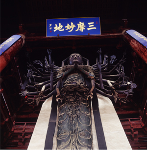 最高大、最古老的千手千眼觀音 大悲閣是隆興寺的主體建筑,閣內(nèi)供奉聞名遐邇的宋代銅鑄“千手千眼觀音菩薩”,俗稱“正定府大菩薩”。它為北宋開寶四年(971)奉太祖趙匡胤之命鑄造。像高21.3米,共42臂,除本身的兩只手、眼外,在身體左右各有20只手,分別執(zhí)日、月、凈瓶、金剛杵、寶劍等法器。銅像身軀高大,比例適度,其形體之巨、雕工之細實為罕見,是世界上古代銅鑄佛像中最高大、最古老的千手千眼觀世音菩薩像。