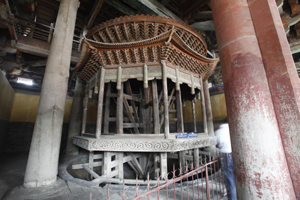 最古老的轉(zhuǎn)輪藏 轉(zhuǎn)輪藏直徑七米,是一座收藏經(jīng)文的旋轉(zhuǎn)書架,外觀形似八角形亭子,中設(shè)木軸,亭身設(shè)有經(jīng)屜,可以存放佛經(jīng),推之可轉(zhuǎn)動。取佛教“法輪常轉(zhuǎn),自動不息”之意,喻佛法猶如輪子輾轉(zhuǎn)相傳,永不停息。佛教中亦有推其旋轉(zhuǎn)與誦讀經(jīng)文同功之說。這種建筑形制國內(nèi)保存下來的甚少,主要有四川平武報恩寺華嚴店和北京智化寺藏殿的明代轉(zhuǎn)輪藏、北京頤和園萬壽山和山西五臺山塔院寺大藏經(jīng)閣清代轉(zhuǎn)輪藏、正定隆興寺轉(zhuǎn)輪藏閣內(nèi)的宋代轉(zhuǎn)輪藏,因此稱其是中國現(xiàn)存最早的轉(zhuǎn)輪藏。