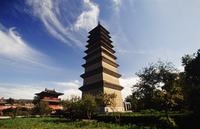 凌霄塔位于正定天寧寺內(nèi),因其以木構(gòu)為主而俗稱木塔。始建于唐代宗年間(762-779年),宋、金均有重修。塔平面呈八角形,為九級磚木混合結(jié)構(gòu)的閣樓式塔,高40.98米,可供人登臨。其精妙之處是于塔心室四層以上保留著對穩(wěn)定塔身極為有利的塔心柱結(jié)構(gòu),這種形式為全國孤例。