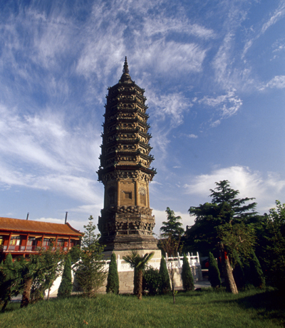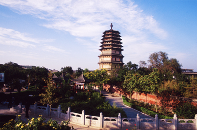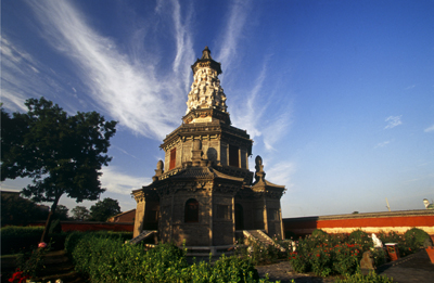 華塔原名多寶塔,始建于唐,高33.35米,矗立在廣惠寺內(nèi)。華塔由主塔和四小塔組成,主塔底層四隅各附建一座扁六邊形亭狀小塔,小塔環(huán)抱主塔,高低錯落,主次相依,精巧華麗,壯觀秀逸。其奇特的平面布局是全國現(xiàn)存為數(shù)不多的其他花塔所不能比擬的,堪稱我國絕無僅有的稀世珍寶。