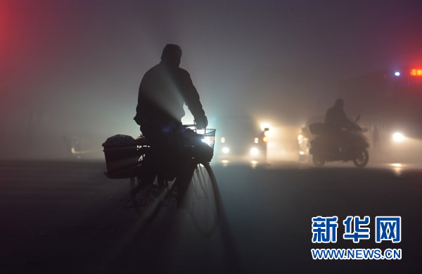 全國多地遭遇霧霾天氣 12月8日,在安徽省阜陽市街頭,市民在霧霾中騎行。