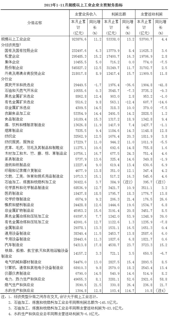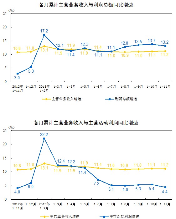 1-11月份,全國規(guī)模以上工業(yè)企業(yè)實(shí)現(xiàn)利潤總額53338億元,比去年同期增長13.2%,增速比1-10月份回落0.5個(gè)百分點(diǎn),其中,主營活動(dòng)利潤[1]53700.7億元,比去年同期增長4.4%,增速比1-10月份回落1個(gè)百分點(diǎn)。