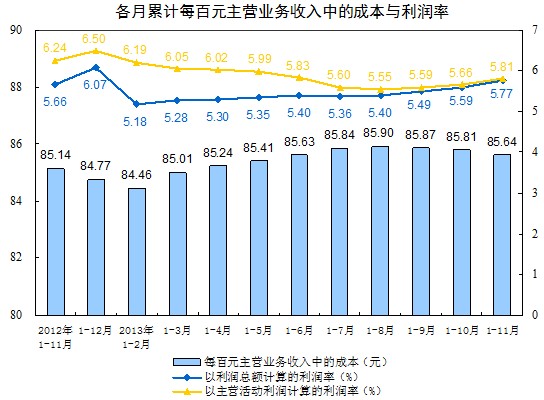 1-11月份,規(guī)模以上工業(yè)企業(yè)實(shí)現(xiàn)主營業(yè)務(wù)收入923876.6億元,比去年同期增長11.2%。每百元主營業(yè)務(wù)收入中的成本為85.64元,以利潤總額計(jì)算的利潤率為5.77%,以主營活動(dòng)利潤計(jì)算的利潤率為5.81%。