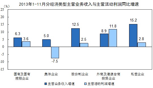 1-11月份,在規(guī)模以上工業(yè)企業(yè)中,國有及國有控股企業(yè)實(shí)現(xiàn)主營業(yè)務(wù)收入232497.6億元,比去年同期增長6.3%,每百元主營業(yè)務(wù)收入中的成本為82.96元,利潤率(按主營活動(dòng)利潤計(jì)算,下同)為5%;集體企業(yè)實(shí)現(xiàn)主營業(yè)務(wù)收入10455.5億元,增長5%,每百元主營業(yè)務(wù)收入中的成本為85.73元,利潤率為7.4%;股份制企業(yè)實(shí)現(xiàn)主營業(yè)務(wù)收入545827.2億元,增長12.5%,每百元主營業(yè)務(wù)收入中的成本為85.54元,利潤率為5.81%;外商及港澳臺(tái)商投資企業(yè)實(shí)現(xiàn)主營業(yè)務(wù)收入218017.8億元,增長8.9%,每百元主營業(yè)務(wù)收入中的成本為86.01元,利潤率為5.46%;私營企業(yè)實(shí)現(xiàn)主營業(yè)務(wù)收入295485.3億元,增長15.2%,每百元主營業(yè)務(wù)收入中的成本為86.92元,利潤率為6.67%。