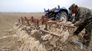 而在新疆南部地區(qū)的一些鄉(xiāng)鎮(zhèn),地膜殘留量甚至達到40多公斤,按每年每畝鋪膜4公斤計算,這相當于給農田鋪了10層地膜!昂敛豢鋸埖卣f,過去是撥開土地找地膜,現(xiàn)在是撥開地膜找土地,形勢堪憂!毙陆r業(yè)廳廳長艾克拜爾·吾甫爾憂心忡忡地說。