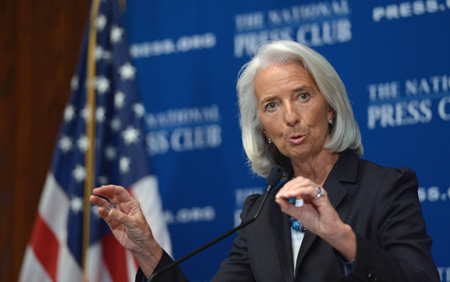 1月15日,國際貨幣基金組織(IMF)總裁拉加德在美國首都華盛頓的全國記者協(xié)會發(fā)表講話。 拉加德15日說,全球經(jīng)濟增長勢頭在2013年下半年得到提升,預計2014年將進一步走強,但世界經(jīng)濟還存在金融市場動蕩和資本流動波動的風險。