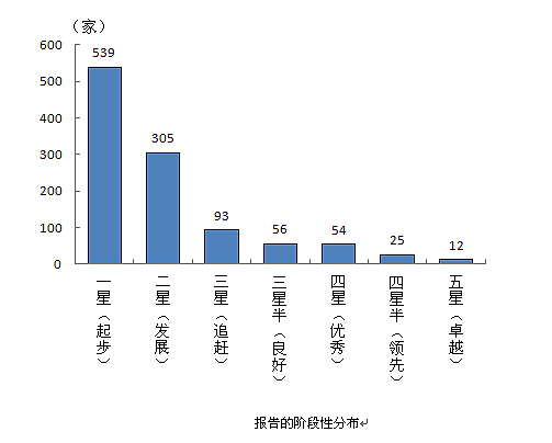 2013年,中國企業(yè)社會責任報告平均分由去年的31.7分上升為35.3分,整體處于發(fā)展階段。中國南方電網(wǎng)公司、中國建筑材料集團有限公司、中國華電集團公司、中國石油化工集團公司、中國石油化工股份有限公司、中國兵器工業(yè)集團公司、中國電信集團公司、國家電網(wǎng)公司、中國建筑股份有限公司、中國華能集團公司、中國移動通信集團公司、中國電子科技集團公司等12家企業(yè)的報告達到五星級,處于卓越階段;25家企業(yè)的報告達到四星半級,處于領(lǐng)先階段;54家企業(yè)的報告為四星級,處于優(yōu)秀水平;56家企業(yè)的報告為三星半級,處于良好水平;93家企業(yè)的報告為三星級,處于追趕水平;305家企業(yè)的報告為二星級,處于發(fā)展水平;539家(49.7%)企業(yè)的報告只有一星級,處于起步階段。