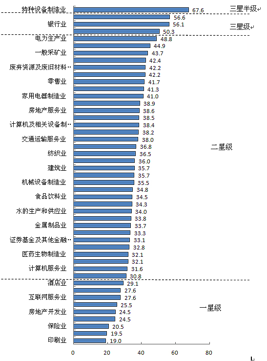 行業(yè)間企業(yè)社會責任報告質(zhì)量差距較大,特種設(shè)備制造業(yè)得分為67.6分,處于三星半(良好)水平;電力供應(yīng)業(yè)、銀行業(yè)、石油和天然氣開采業(yè)與加工業(yè)得分分別為56.6分、56.1分、50.3分,處于三星(追趕)水平;電力生產(chǎn)業(yè)、通信服務(wù)業(yè)、一般采礦業(yè)、交通運輸設(shè)備制造業(yè)、廢棄資源及廢舊材料回收加工業(yè)等34個行業(yè)社會責任報告綜合得分位于30-50分之間,處于二星級(發(fā)展)水平;酒店業(yè)、農(nóng)林牧漁業(yè)、互聯(lián)網(wǎng)服務(wù)業(yè)、文化娛樂業(yè)、房地產(chǎn)開發(fā)業(yè)、木材加工與家具制造業(yè)等9個行業(yè)的得分在30分以下,處于一星級(起步)水平。各行業(yè)社會責任報告得分及階段分布如圖0-15所示。
