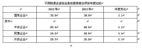 與去年相比,國有企業(yè)社會責任報告綜合得分由35.9分提高到39.0分,上升了3.1分,國有企業(yè)中的中央企業(yè)從65.4分提高到69.6分,上升了4.2分;民營企業(yè)由24.2分提高到28.6分,增長了4.4分,但仍然處于起步(一星級)階段;而外資企業(yè)則由去年的29.7分提高到35.0分,從起步(一星級)階段提高到發(fā)展(二星級)階段。
