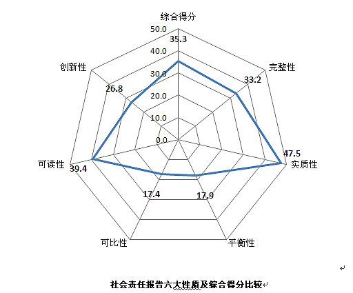 從完整性、實質(zhì)性、平衡性、可比性、可讀性、創(chuàng)新性等“六性”來看,中國企業(yè)社會責任報告的實質(zhì)性得分最高,為47.5分,處于二星(發(fā)展)水平,即報告在披露企業(yè)社會責任關(guān)鍵議題方面表現(xiàn)較好;可讀性得分其次,為39.4分,即報告綜合運用了圖表等表現(xiàn)形式,利于讀者閱讀;報告完整性、創(chuàng)新性得分相對適中,分別為33.2分和26.8分,處于二星和一星水平。另外,報告平衡性與可比性較差,分別為17.9分和17.4分,處于一星(起步)水平,說明多數(shù)企業(yè)沒有披露連續(xù)的關(guān)鍵績效指標,并定量說明本企業(yè)社會責任履責水平在同行業(yè)中所處位次??傮w而言,中國企業(yè)社會責任報告的“六性”都還有較大的改進空間。