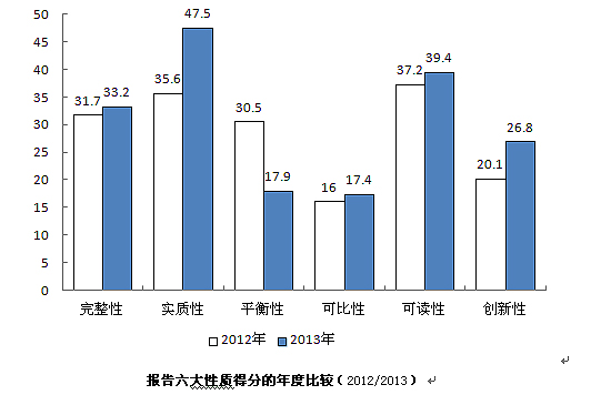 與去年相比,實質(zhì)性和平衡性表現(xiàn)較明顯,其他方面表現(xiàn)穩(wěn)定。其中,實質(zhì)性由去年的35.6分提高到47.5分,提高了11.9分,說明企業(yè)越來越關(guān)注關(guān)鍵性議題的識別,注重與相關(guān)方進行實質(zhì)性的交流和溝通;六大性質(zhì)中得分降低較為明顯的是平衡性,由去年的30.5分降低到17.9分,說明很多企業(yè)在報告編寫過程中忽視負面信息的披露,存在“報喜不報憂”的現(xiàn)象。