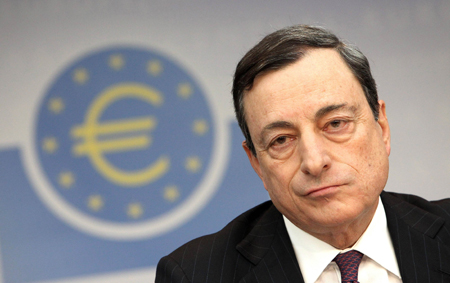 圖為歐洲央行行長(zhǎng)德拉吉在當(dāng)日舉行的發(fā)布會(huì)上表示,歐元區(qū)并未處于通縮當(dāng)中,但歐洲央行會(huì)對(duì)物價(jià)持續(xù)走低保持警惕。