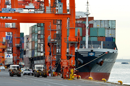 日本10日公布的數(shù)據(jù)顯示,受巨額貿(mào)易逆差拖累,2013年日本國際收支經(jīng)常項目順差額創(chuàng)歷史新低,為3.3061萬億日元,比前一年減少31.5%。數(shù)據(jù)還顯示,經(jīng)季節(jié)調(diào)整后,2013年12月日本國際收支經(jīng)常項目出現(xiàn)1967億日元逆差額,為連續(xù)4個月出現(xiàn)逆差。圖為10日在日本東京的一個貨運碼頭,貨輪正在裝載貨物。
