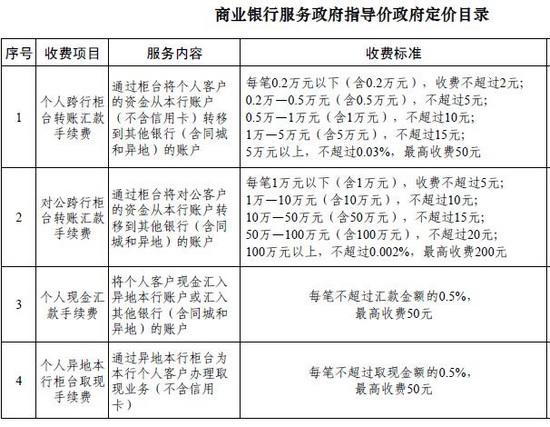 根據(jù)發(fā)展改革委、銀監(jiān)會(huì)公布的《關(guān)于印發(fā)商業(yè)銀行服務(wù)政府指導(dǎo)價(jià)政府定價(jià)目錄的通知》,商業(yè)銀行為銀行客戶提供的基礎(chǔ)金融服務(wù)實(shí)行政府指導(dǎo)價(jià)、政府定價(jià)管理,包括部分轉(zhuǎn)賬匯款、現(xiàn)金匯款、取現(xiàn)和票據(jù)等服務(wù)項(xiàng)目,具體收費(fèi)項(xiàng)目和標(biāo)準(zhǔn)按《商業(yè)銀行服務(wù)政府指導(dǎo)價(jià)政府定價(jià)目錄》執(zhí)行。
