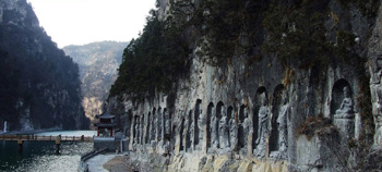 站在雙姑峰上朝下一望,竟然發(fā)現(xiàn)了新的景點。寺后下面風(fēng)光綺麗,湖色優(yōu)美,碧波蕩漾,湖面上游客乘坐快艇,艇后泛起白色浪花。一尊漢白玉觀世音菩薩佛像6米多高,亭亭玉立在湖面中央。對面的山崖下,開鑿了許多石刻佛像。如此有這般好風(fēng)景,不由令人加快腳步走下坡底。過了天橋,走到對岸,觀看了湖面兩岸雕刻的個性鮮明、形態(tài)逼真的216尊佛教摩崖造像。