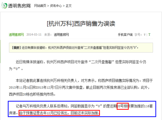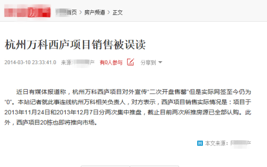 杭州萬科"售罄"項(xiàng)目成交仍為零》的調(diào)查報(bào)道,針對杭州萬科旗下項(xiàng)目——萬科西廬、萬科璞悅灣,“售罄”“熱銷”三個月后網(wǎng)簽實(shí)際情況與其之前宣傳的“大賣”相去甚遠(yuǎn)進(jìn)行了分析與報(bào)道。