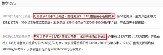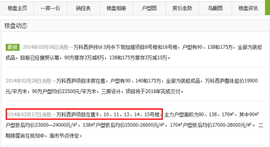 同時新華網(wǎng)記者發(fā)現(xiàn),根據(jù)杭州萬科的這份聲明,在拿出“捂”了一個月的預(yù)售證之后,10幢、13幢、14幢、15幢號樓終于在12月7日推向市場了。當(dāng)然,當(dāng)時對外杭州萬科也繼續(xù)宣稱二次開盤“售罄”。但在透明售房網(wǎng)的樓盤動態(tài)中,2014年2月7日,萬科西廬的9幢、10幢、11幢、13幢、14幢、15幢卻依然在售。曾經(jīng)全部“售罄”的六幢樓又重現(xiàn)市場了。