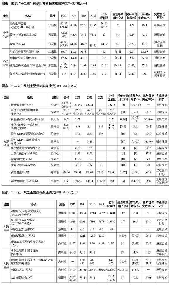 2014年2月24日,國家統(tǒng)計局公布了《2013年國民經(jīng)濟和社會發(fā)展統(tǒng)計公報》,有關(guān)部門如國家環(huán)境保護部等也相繼介紹了2013年實施情況,這就可以使我們根據(jù)《中華人民共和國國民經(jīng)濟和社會發(fā)展第十二個五年規(guī)劃綱要》所提出的經(jīng)濟社會發(fā)展指標(biāo),按目標(biāo)一致法對2011-2013年進行第二次中期評估。由于中國是采用五年規(guī)劃期,以2010年為基年,對2011-2013年的中期評估主要是基于對五年目標(biāo)完成率,可以分為四類:一是未達到60%者視為“進度滯后”;二是達到或超過60%者視為“進展良好”;三是接近100%者視為“接近五年目標(biāo)”;四是達到或超過100%者視為“完成五年目標(biāo)”。