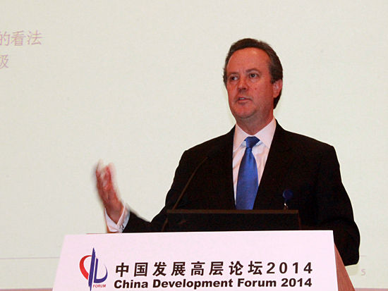 “中國發(fā)展高層論壇2014”于3月22日-24日在釣魚臺舉行。上圖為麥格希財訊集團總裁道格拉斯·彼得森在《透視政府債務(wù)風(fēng)險》主題論壇發(fā)言。