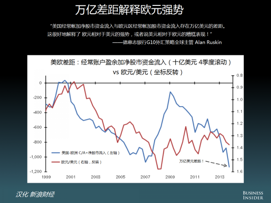 “美國經常帳加凈股市資金流入與歐元區(qū)經常帳加股市資金流入存在萬億美元的差距。這很好地解釋了歐元相對于美元的強勢,或者說美元相對于歐元的糟糕表現(xiàn)!”——德意志銀行G10外匯策略全球主管Alan