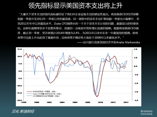 CFO調查也有一個關于資本開支計劃的問題,數(shù)據(jù)顯示的結果類似。這種樂觀情緒受多個因素所推動,首要的一點就是對營收增長加速的預期。根據(jù)商業(yè)圓桌CEO調查,截止到一季度,受訪者預計2014年增速為2.4%,為2011年以來對未來一年最強勁的預測。財政政策可見度上升也起到了重要作用,目前政策不確定性大致處于2008年以來最低水平!薄ㄅd銀行首席美國經濟學家Aneta