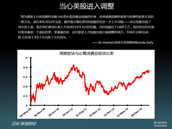 “圖為摩根士丹利周期性指數(shù)與標普必需消費品指數(shù)的比率,是我觀察周期性股票與防御性股票關系的一種方法。該比率在2012年見底,最終預示著標普500指數(shù)仍有進一步上升動能——此后指數(shù)出現(xiàn)了36%的上漲。現(xiàn)在我們看到比率上升到2011年5-6月的位置。當時指數(shù)位于1400下方,現(xiàn)在的點位在那時看來像是一個遙遠的夢。更重要的是,這可能是上次指數(shù)出現(xiàn)大幅調整的地方。市場在1360見頂,然后在接下來5個月內跌了大約20%!薄狪G
