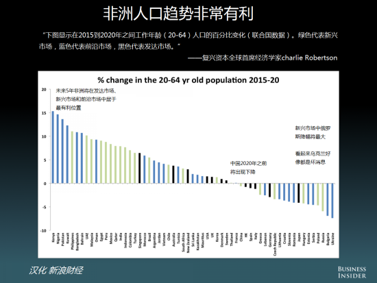“下圖顯示在2015到2020年之間工作年齡(20-64)人口的百分比變化。綠色代表新興市場,藍色代表前沿市場,黑色代表發(fā)達市場!薄獜团d資本全球首席經濟學家charlie